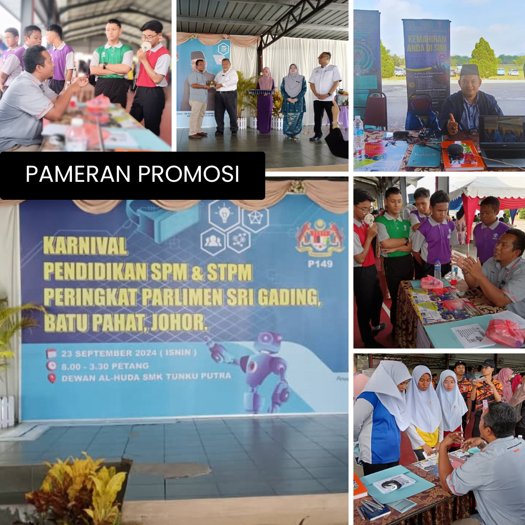 September 23, 2024 - ILP Tangkak through the Promotion Division, Student Management and Training Division (BPPL) participated in the Exhibition at the Sri Gading Parliament's SPM and STPM Education Carnival which took place at Dewan Al-Huda, SMK Tunku Putra, Batu Pahat.