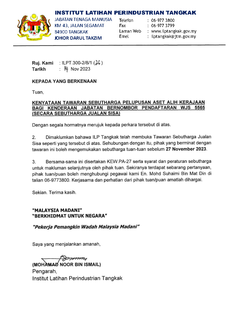 Klik Untuk Melihat Dokumen Sebutharga Pelupusan Aset Alih Kerajaan Bagi Kenderaan Jabatan Bernombor Pendaftaran WJS 5565 (Secara Sebutharga Jualan Sisa)